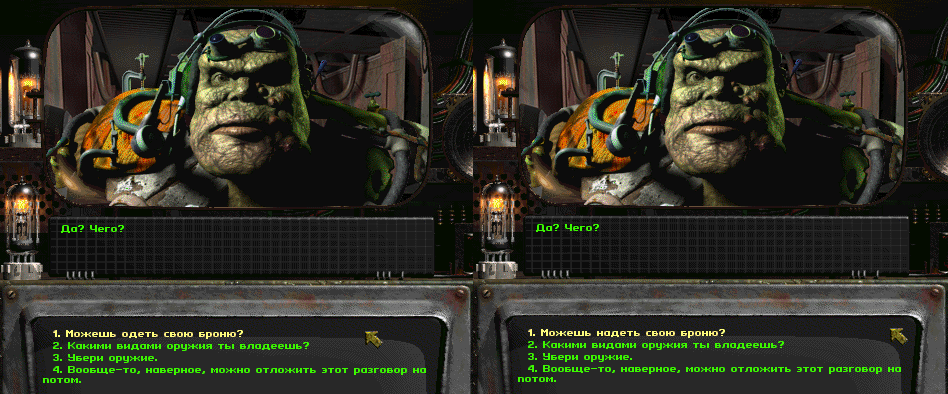 Нравится поигрывать в добрый старый Fallout 2 с оригинальной аудиодорожкой и с текстами/субтитрами на русском, но перевод от 1С, взятый за основу в последние патчи, и в особенности тексты дополнительного контента самих этих патчей - это местами такое чёрти что, что хоть переключай на оригинал. Попробовал по мере сил исправить это всё, куда дотянулся.
